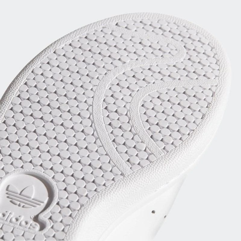 La tige en cuir synthétique offre un rendu lisse et soigné, tandis que les trois bandes perforées et les logos Stan Smith sur la languette et le contrefort rappellent l’héritage authentique du modèle.