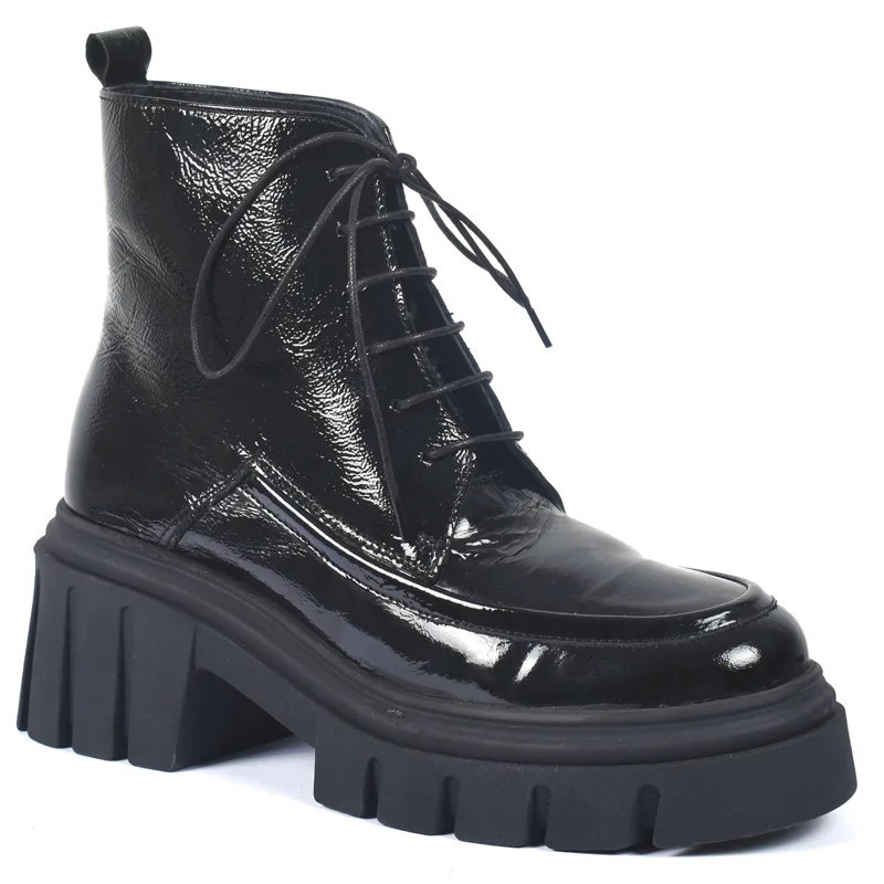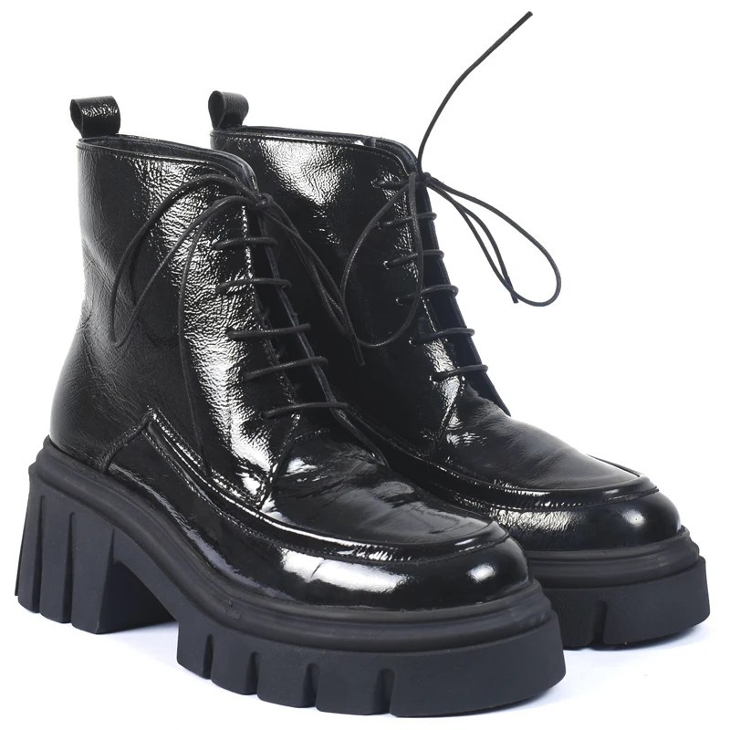 BOTTINE FEMME CUIR NOIR VERNIS À LACETS