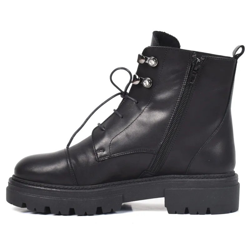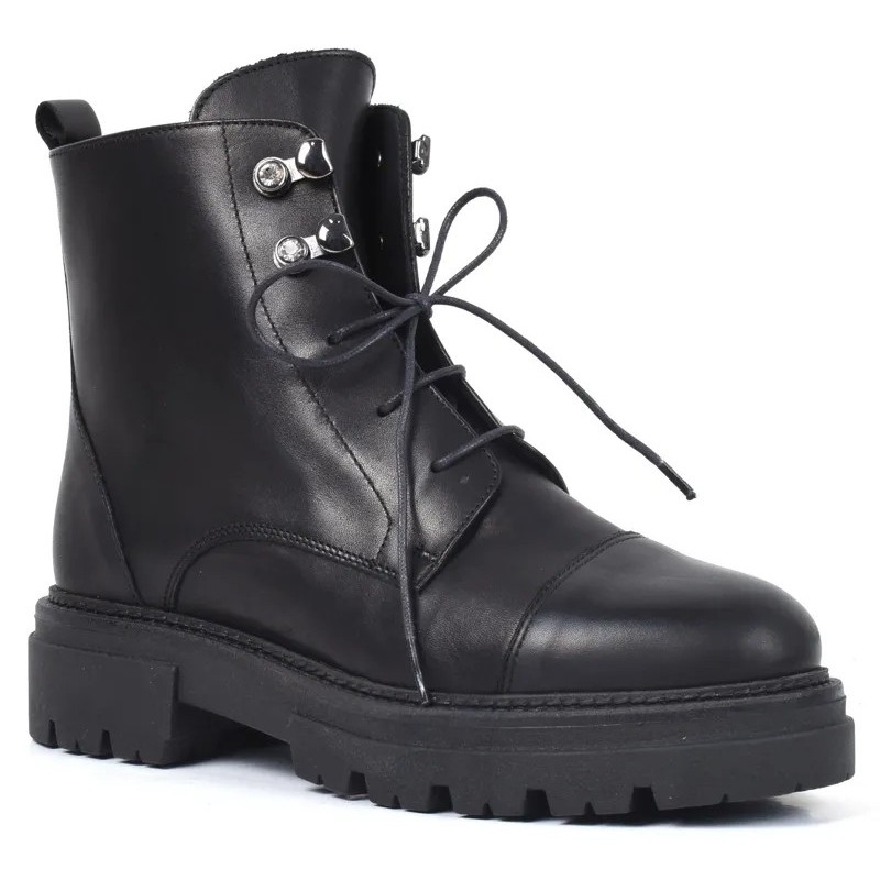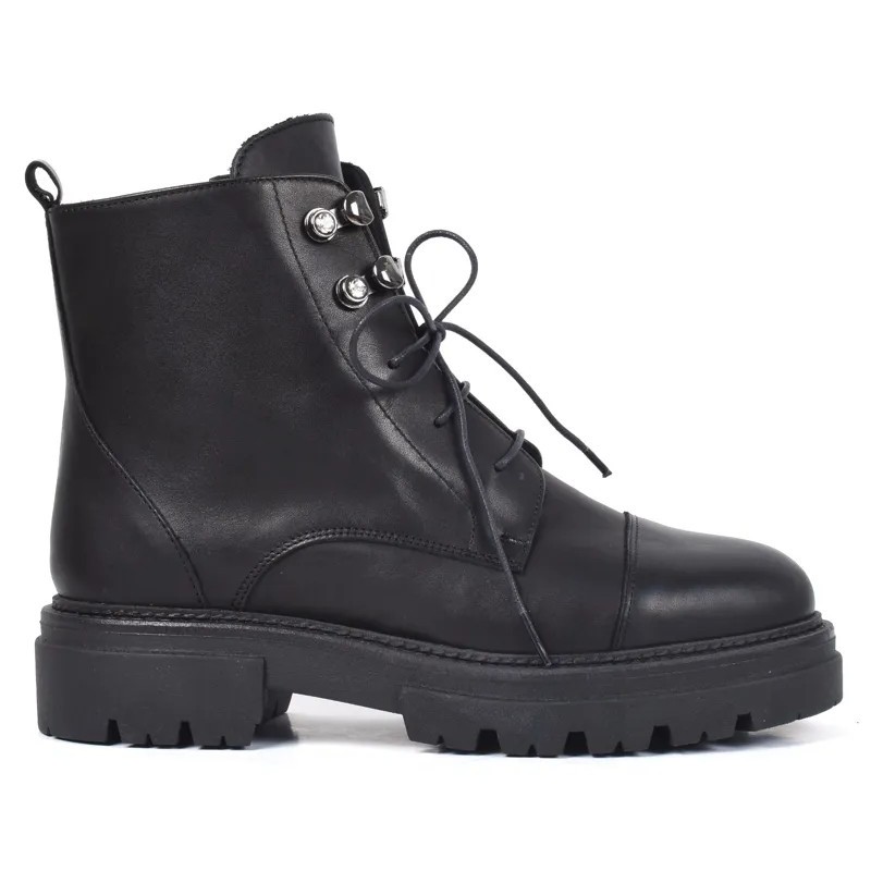 Bottine noire élégante en cuir, à semelle crantée confortable.