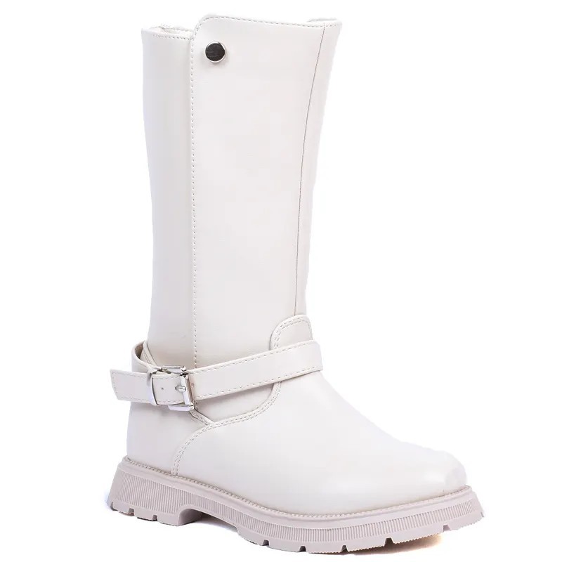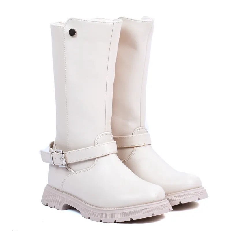 Bottes fille beiges avec tige haute et boucle décorative, confortables et élégantes pour l’hiver.