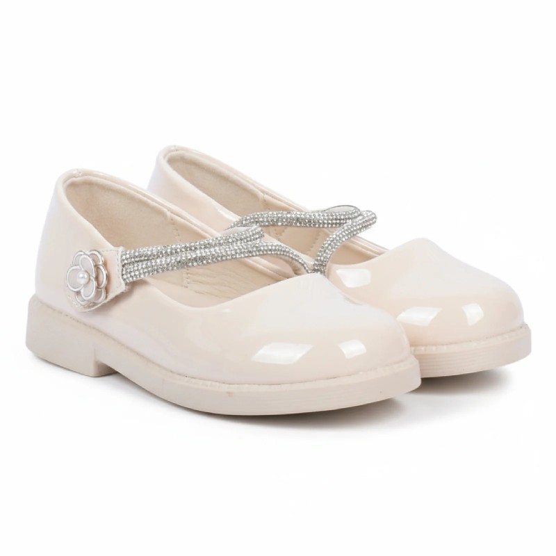 Ces babies pour fille séduisent par leur finition vernie brillante et leur allure élégante. Le modèle est sublimé par une bride recouverte de strass scintillants, apportant une touche chic et raffinée. Un détail floral décoratif avec perle centrale vient embellir le côté de la chaussure pour un rendu délicat et sophistiqué.