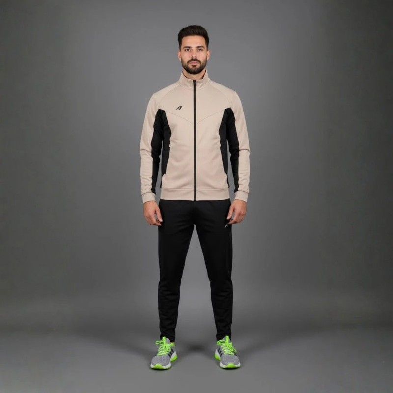 Survêtement homme beige en satin, alliant élégance, confort et allure moderne.
