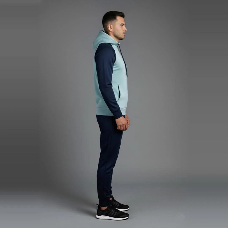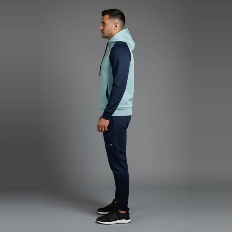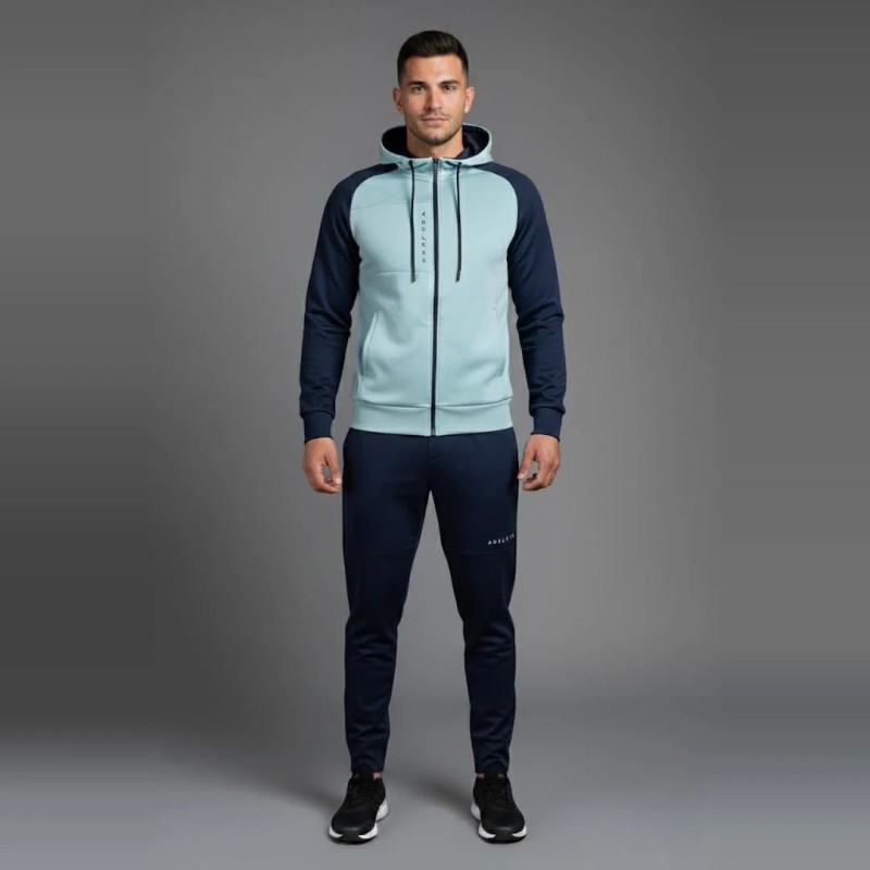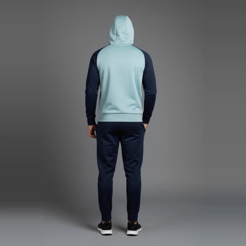 La veste zippée vert d’eau se distingue par sa capuche confortable et ses manches bleu marine qui ajoutent une touche premium. Le pantalon assorti offre une coupe moderne et ajustée, idéale pour le sport ou le quotidien. Grâce à son mélange polyester/élasthanne, cet ensemble garantit un confort supérieur, une bonne respirabilité et une grande facilité d’entretien.