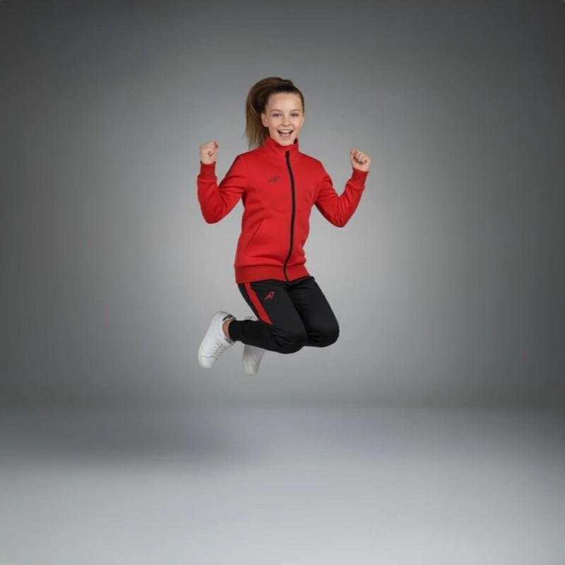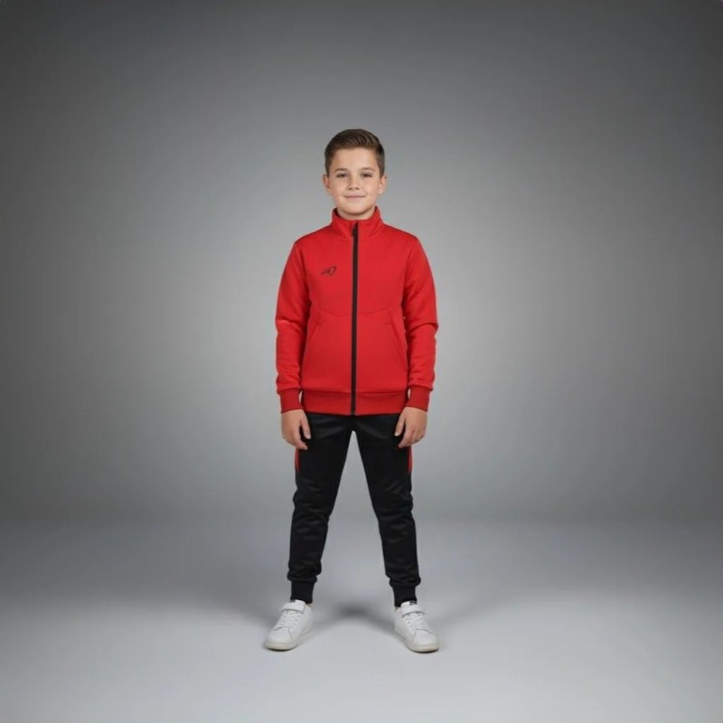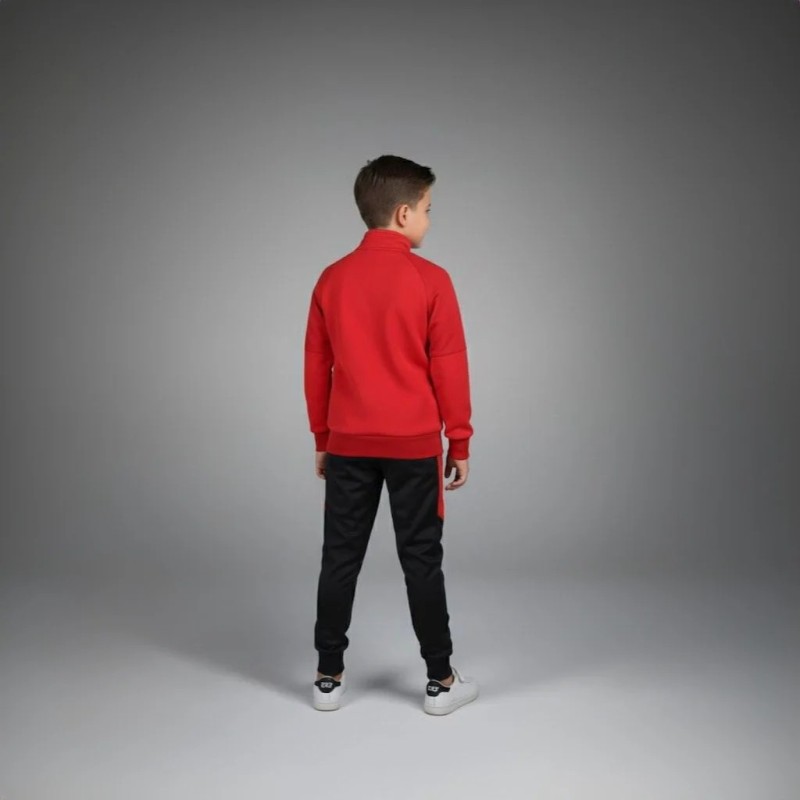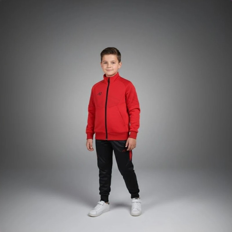 Survêtement enfant dynamique composé d’une veste rouge zippée et d’un pantalon noir. Idéal pour le sport, l’école et les sorties quotidiennes.