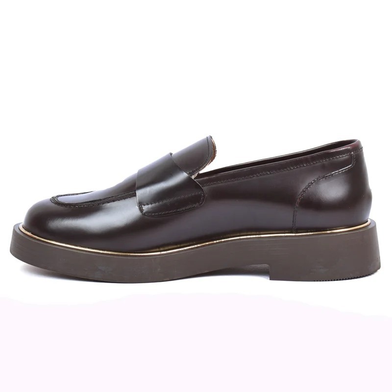 Mocassin Penny Loafer femme Andrea Bruni 100% cuir marron foncé, semelle épaisse noire avec liseré doré. Réf. AB-360-4-M.