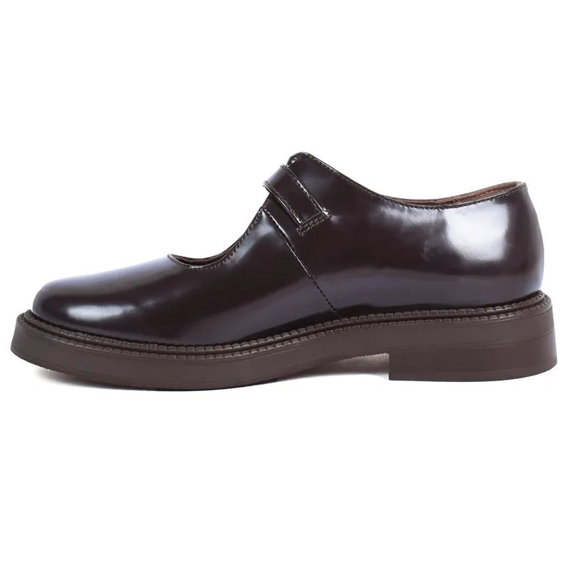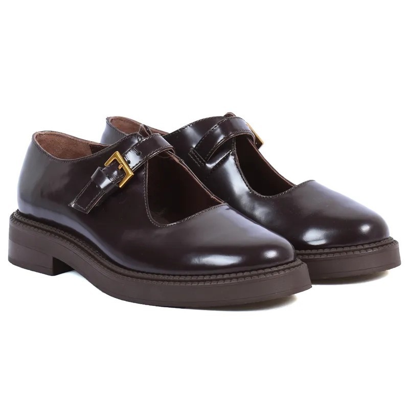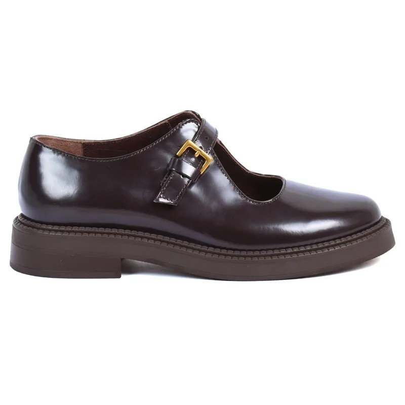 chaussure à bride en cuir bordeaux avec boucle dorée, chic et confortable.