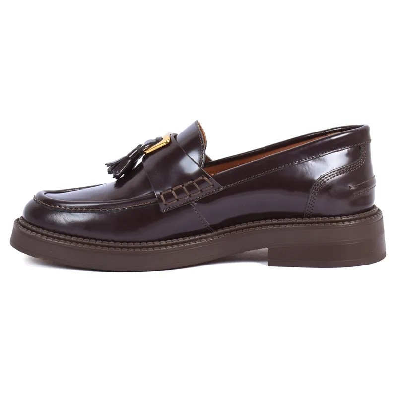 Mocassin marron à pompom élégant, cuir lisse et semelle épaisse.