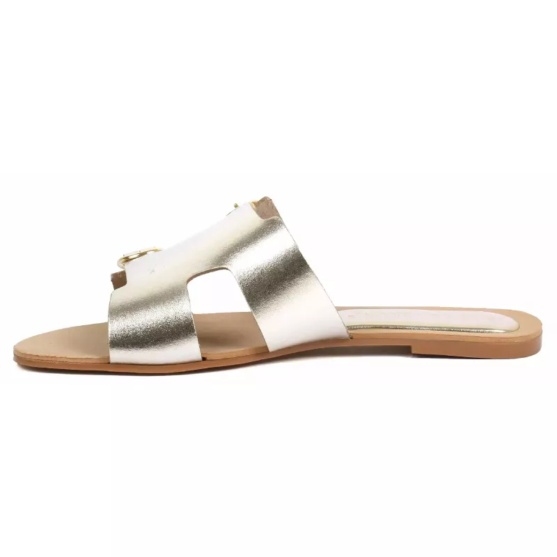Mules plates cuir métallisé doré à double bride ornée de boucles rondes dorées, semelle confort assortie – Andrea Bruni.