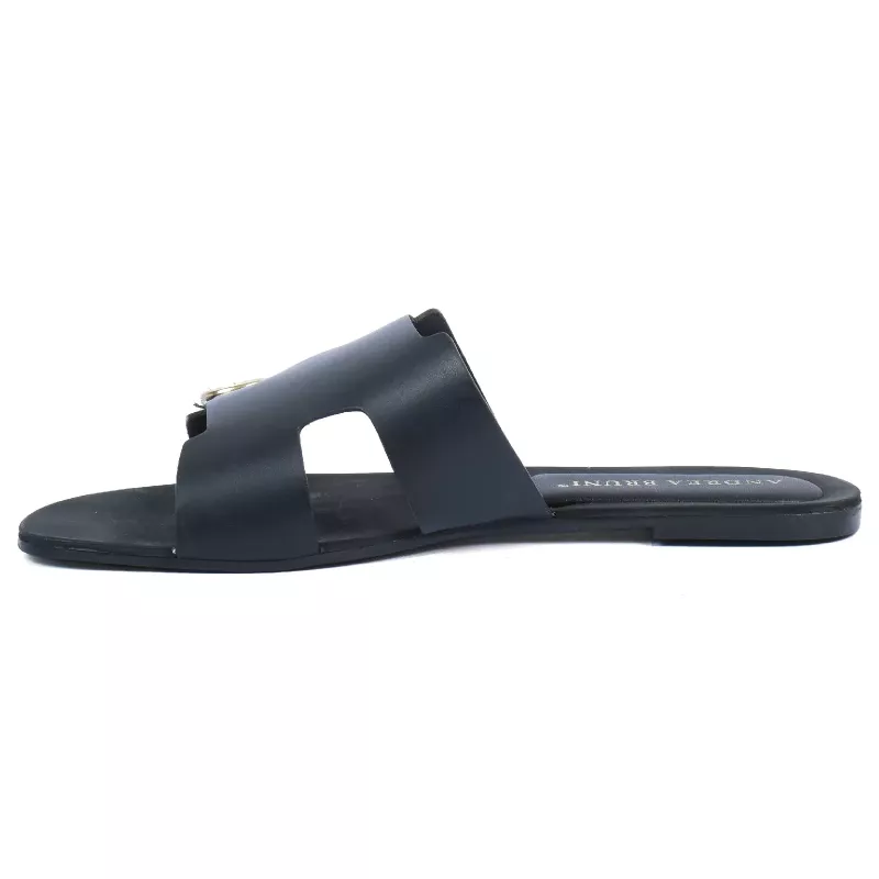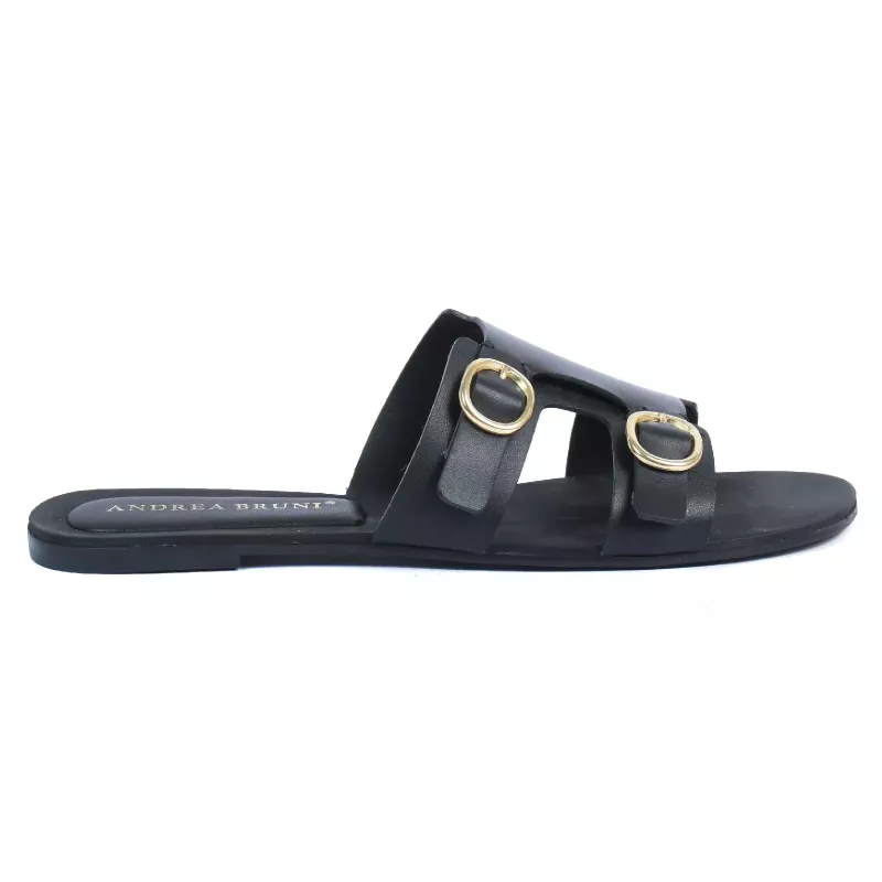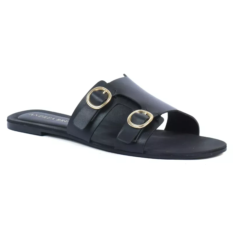 Mules plates cuir noir à double bride ornée de boucles rondes dorées, semelle confort assortie – Andrea Bruni.