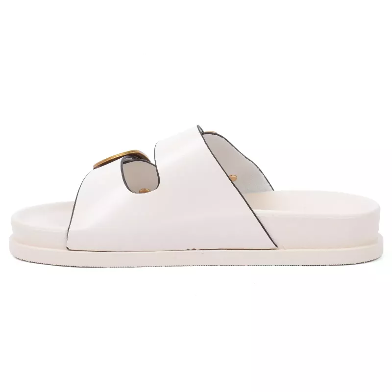 Mule femme en daim à larges brides. Ils ont des clous métalliques. Tresse bohème autour de la semelle. Semelle intérieure de forme anatomique.