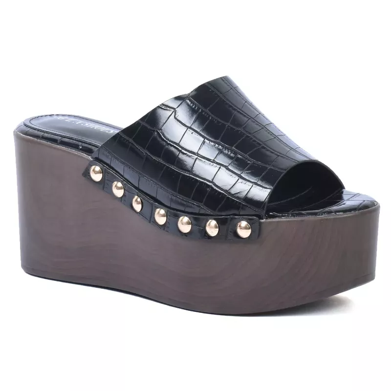 Affirmez votre style avec cette mule compensée pour femme de la marque GLA. Son design effet croco associé à des détails cloutés apporte une touche tendance et moderne, idéale pour sublimer vos tenues tout en profitant d’un confort optimal grâce à sa plateforme stable.