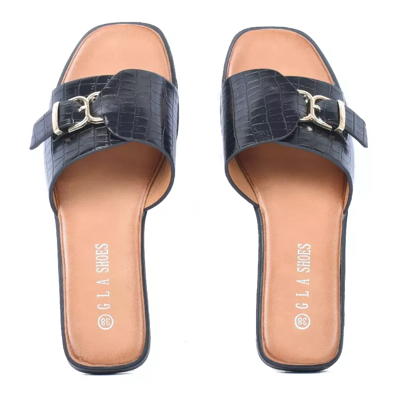 Apportez une touche élégante à vos tenues avec cette mule plate pour femme signée GLA. Son effet croco raffiné associé à une boucle métallique décorative offre un style moderne et sophistiqué. Facile à enfiler, elle assure un confort optimal pour un usage quotidien.