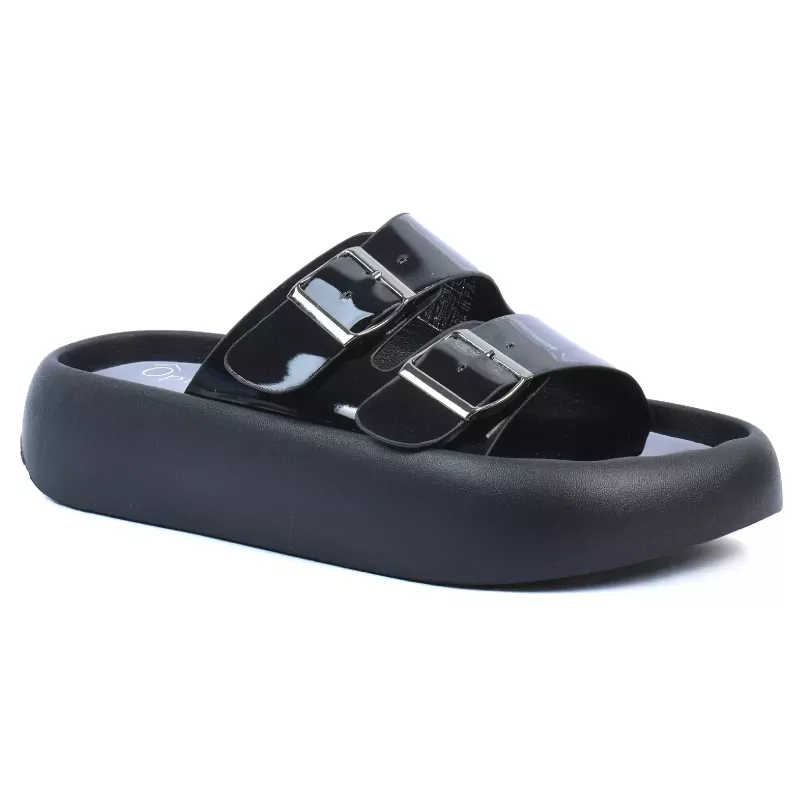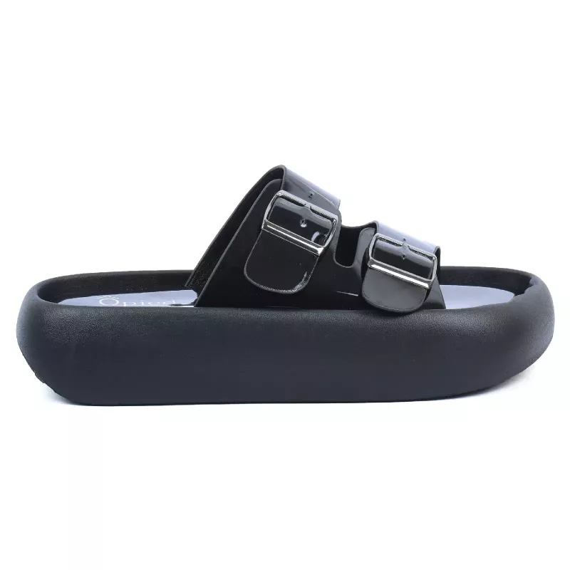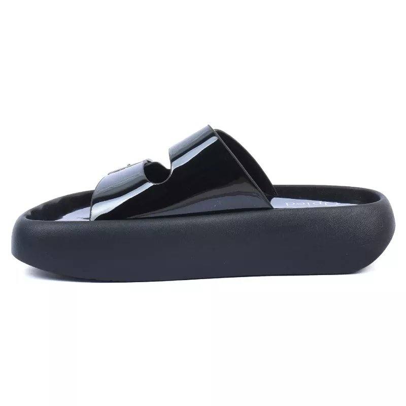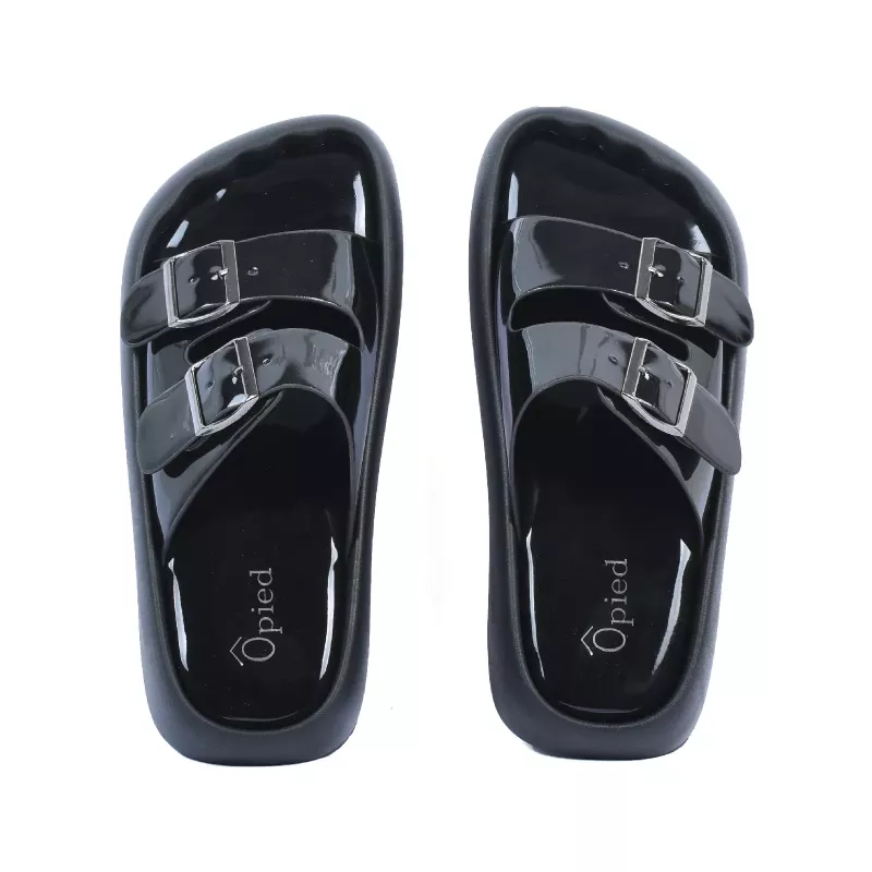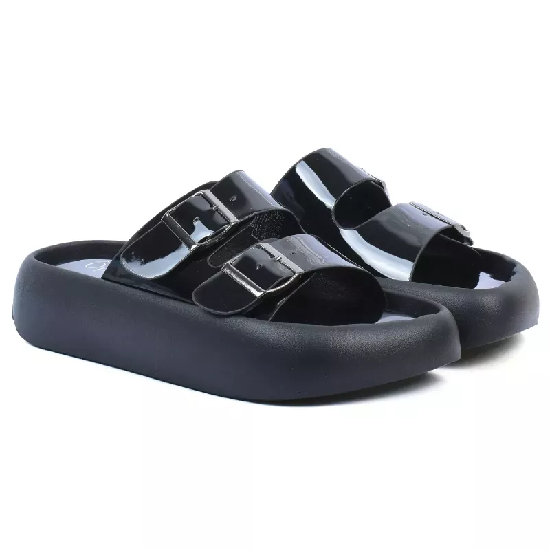 Mules plateforme verni noir à double bride avec boucles argentées, semelle confort arrondie – Opied.