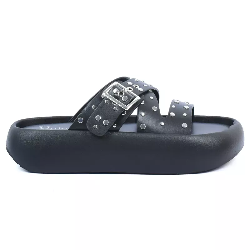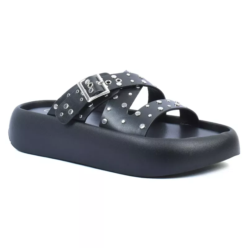 Mules plateforme noir à brides croisées ornées de clous et œillets argentés, grande boucle argentée – Opied.