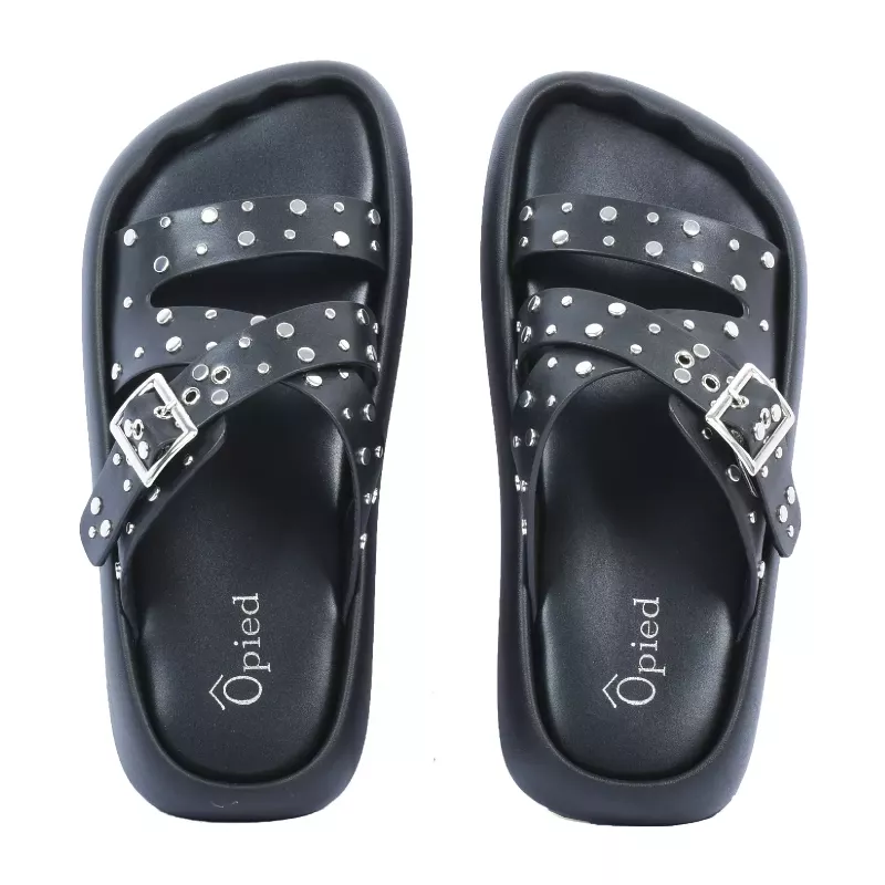 Affirmez votre style rock avec ces mules plateforme noir signées Opied. Leurs brides croisées sont parsemées de clous et œillets argentés pour un effet edgy assumé, tandis que la grande boucle carrée argentée apporte une touche audacieuse. La semelle plateforme généreuse garantit confort et maintien toute la journée.