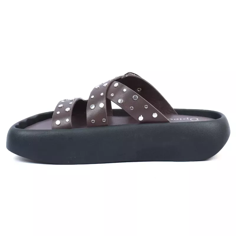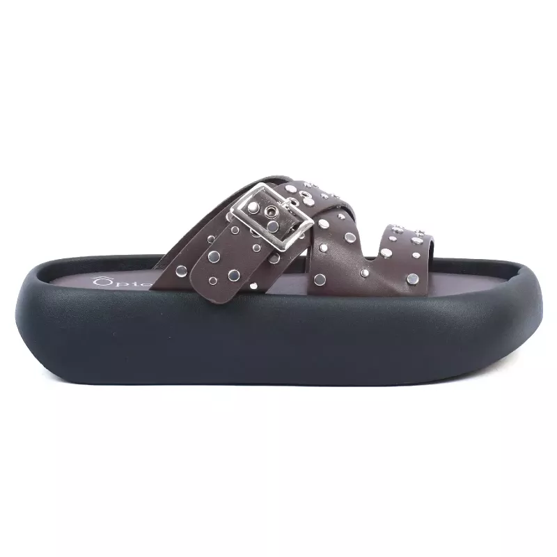 Mules plateforme marron à brides croisées ornées de clous et œillets argentés, grande boucle argentée – Opied.