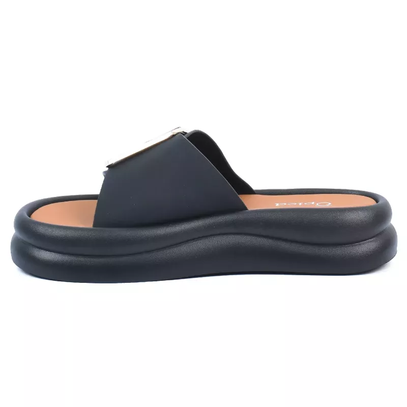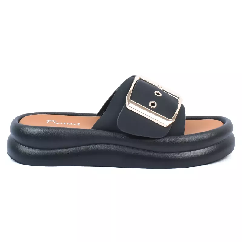 Misez sur l'élégance minimaliste avec ces mules plateforme noir signées Opied. Leur bride unique se distingue par une imposante boucle dorée rose qui apporte une touche luxueuse et sophistiquée. La semelle plateforme généreuse garantit un confort optimal pour toutes vos sorties estivales.