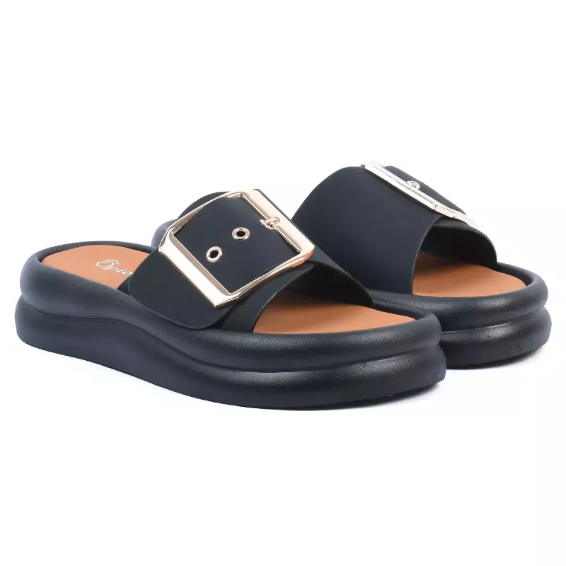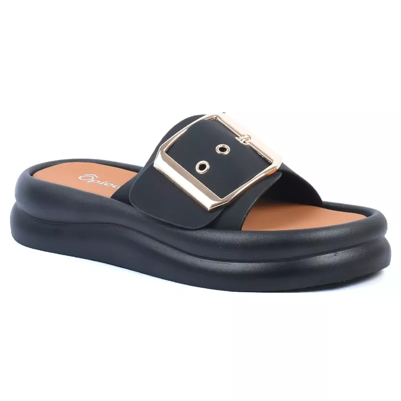 Mules plateforme noir à bride unique ornée d'une grande boucle dorée rose, semelle confort noire – Opied.