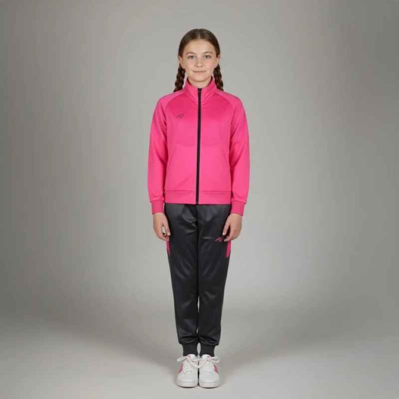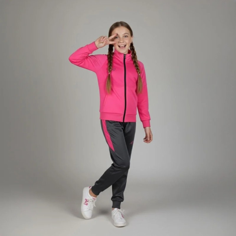 Survêtement enfant tendance composé d’une veste rose fuchsia zippée et d’un pantalon noir. Confortable, moderne et idéal pour l’école, le sport et les sorties quotidiennes.