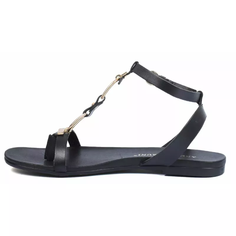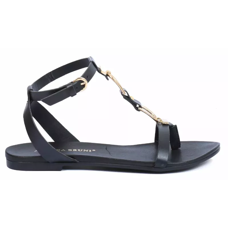 Sublimez vos looks estivaux avec ces sandales plates en cuir noir signées Andrea Bruni. Leur bride en T se distingue par un ornement chaîne dorée élégant qui apporte une touche bijou raffinée. La bride de cheville réglable par boucle ronde dorée assure un maintien parfait pour toutes vos occasions.