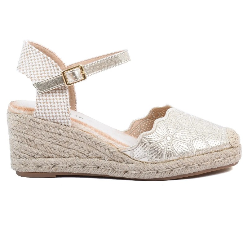 Apportez une touche raffinée et lumineuse à vos tenues estivales avec ces sandales compensées pour femme. Leur semelle effet corde associée à un dessus délicatement travaillé offre un style chic et féminin. Avec un talon de 7,5 cm, elles élancent la silhouette tout en garantissant stabilité et confort au quotidien.