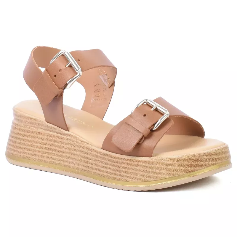 Sandales plateforme en cuir camel avec brides ajustables et semelle compensée confortable, idéales pour un usage quotidien alliant style et stabilité.
