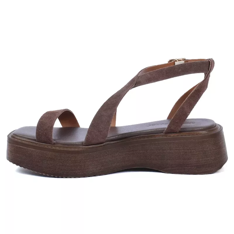 Sandales compensées daim marron à brides croisées fines et boucle dorée, plateau 5 cm – Andrea Bruni.