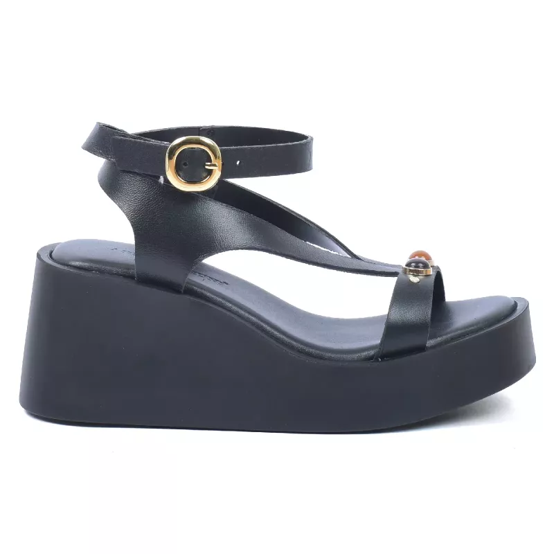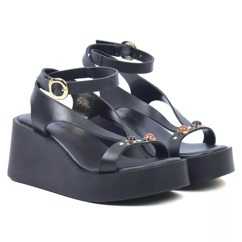 Sandales compensées cuir noir à brides fines, ornements cabochons dorés, plateau 3 cm et talon 7 cm – Andrea Bruni.