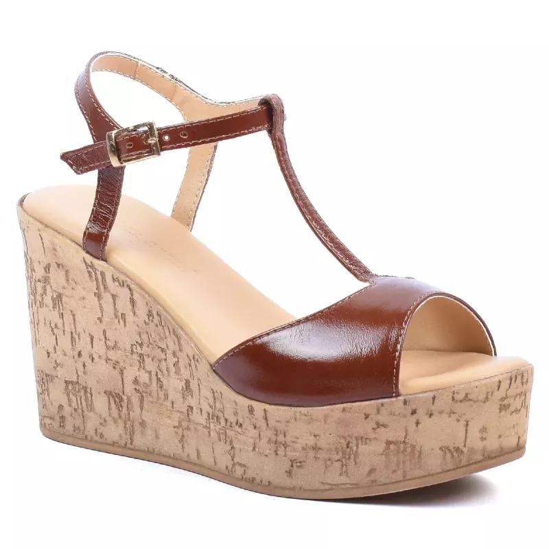 Sandales compensées cuir verni marron à bride en T, semelle liège, plateau 3,5 cm et talon 10 cm – Andrea Bruni.