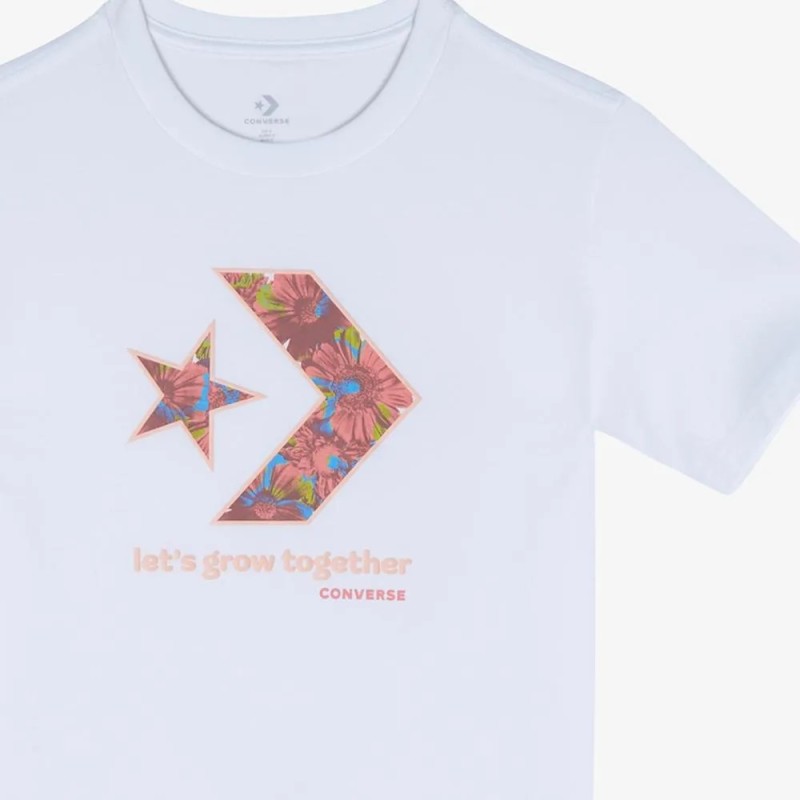 UN T-SHIRT FLORAL, FRAIS ET INSPIRANT. Le T-shirt Converse femme "Let’s Grow Together" allie douceur, style et message positif. Confectionné en jersey 100 % coton, il garantit une respirabilité agréable, idéale pour les journées d’été.